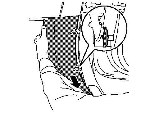 Pull dash side finisher straight toward vehicle rear. Otherwise, pawls may be damaged if front end of dash side finisher opens toward vehicle inside.