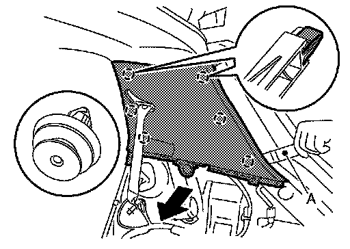 Disengage rear pillar finisher fixing clips with a remover tool (A), and then remove rear pillar finisher.