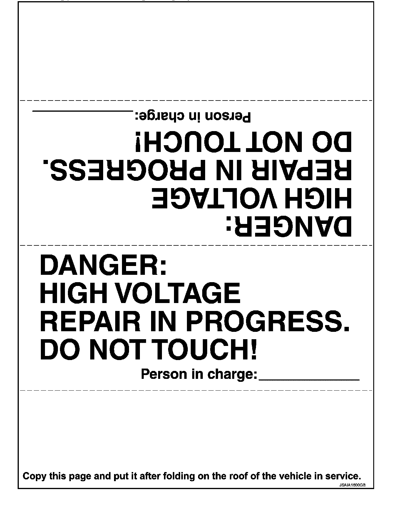 - Clearly identify the persons responsible for high voltage work and ensure that other persons do not touch the vehicle. When not working, cover high voltage parts with an insulating cover sheet or similar item to prevent other persons from contacting them.