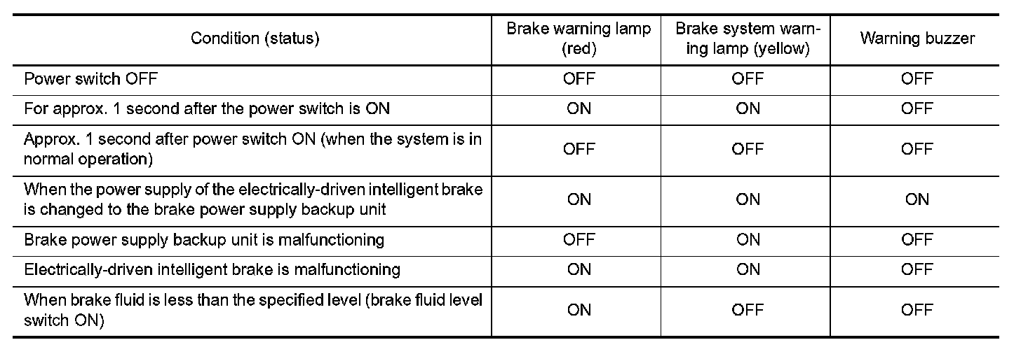 - When a malfunction occurs in the electrically-driven intelligent brake and in the VDC function, the braking force is determined by the force pressing on the brake pedal (no boost operation). At the same time, the brake warning lamp (red) and brake system warning lamp (yellow) turn ON.