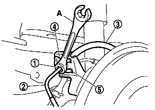 5.Loosen the flare nut (1) with a flare nut wrench (A) and separate the brake tube A (2) from the hose A (3).
