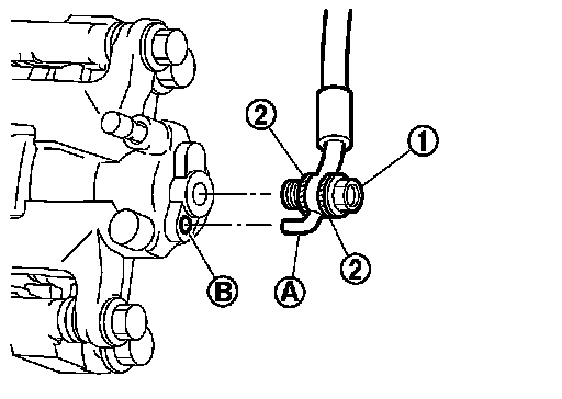 2.Align the brake hose B L-pin (A) with the brake caliper assembly hole (B), and tighten the union bolt (1) to the specified torque.
