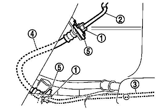 3.Install the brake tube A (2) to the brake hose A (1), temporarily tighten the flare nut (3) by hand until it does not rotate further, and fix the brake hose A to the brake hose bracket (5) with the lock plate (4).
