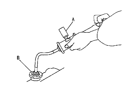- Use hose adapter (B) (commercial service tool) between radiator cap tester (A) (commercial service tool) and the filler neck so that the degas tank filler neck is not deformed.