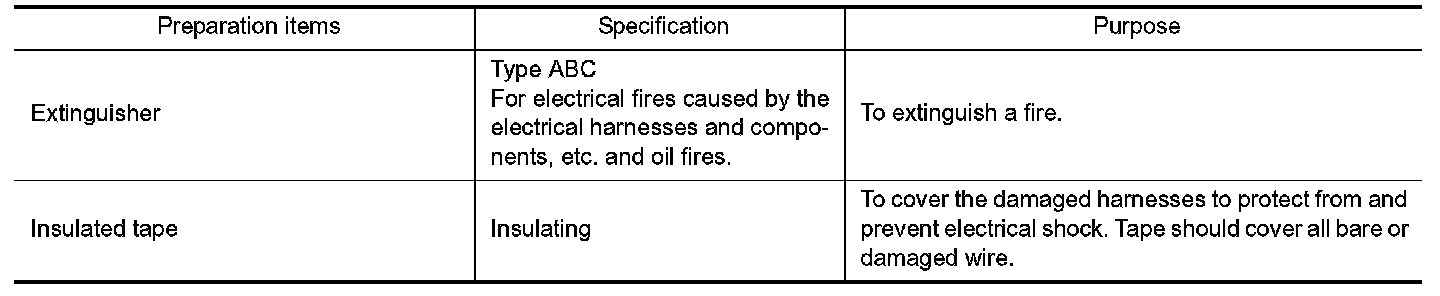 In the event of a small fire, a Type ABC fire extinguisher may be used for an electrical fire caused by wiring harnesses, electrical components, etc. or oil fire.