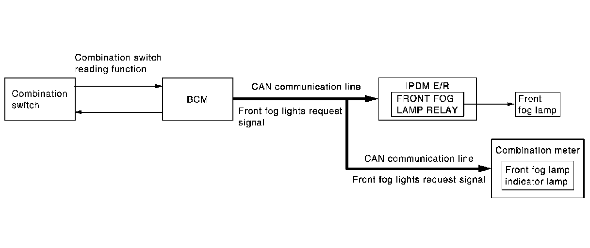 - BCM transmits the front fog lights request signal to IPDM E/R and the combination meter via CAN communication according to the front fog lamp ON condition.