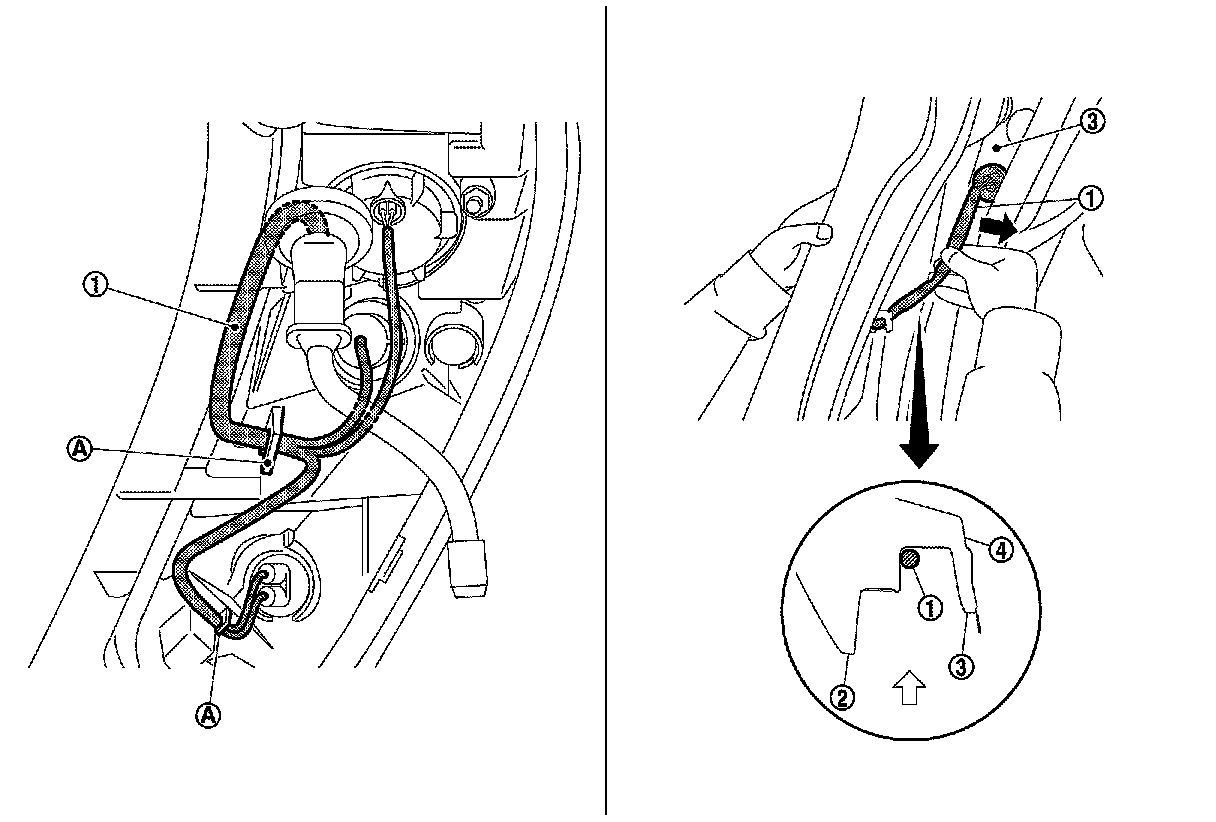 When installing rear combination lamp, fix harness using harness fixing hook (A) on backside of rear combination lamp housing and place harness toward vehicle inside so that harness is not pinched by rear fender panel.
