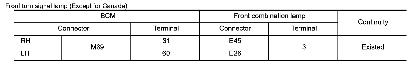 Check continuity between BCM harness connector and front combination lamp, side turn signal lamp or rear combination lamp and ground.