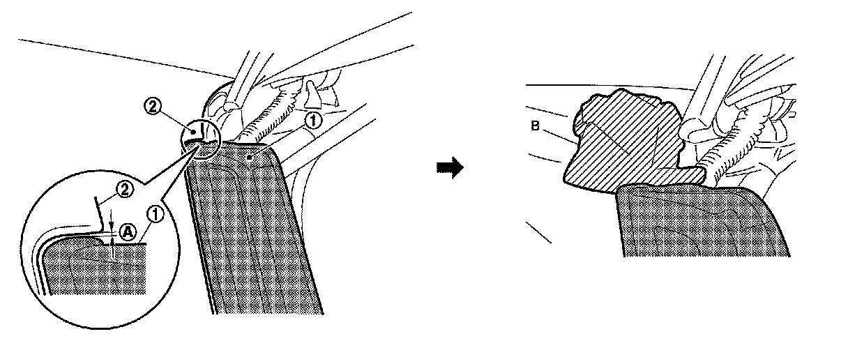 2.Insert a shop cloth (B) into clearance (A) between rear combination lamp (1) and rear fender panel (2), or apply protective tape.