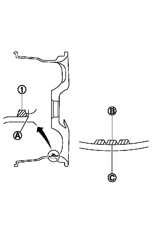 - When installing balance weight (1) to road wheels, set it into the grooved area (A) on the inner wall of the road wheel as shown in the figure so that the balance weight center (B) is aligned with the tire balance machine indication position (angle) (C).