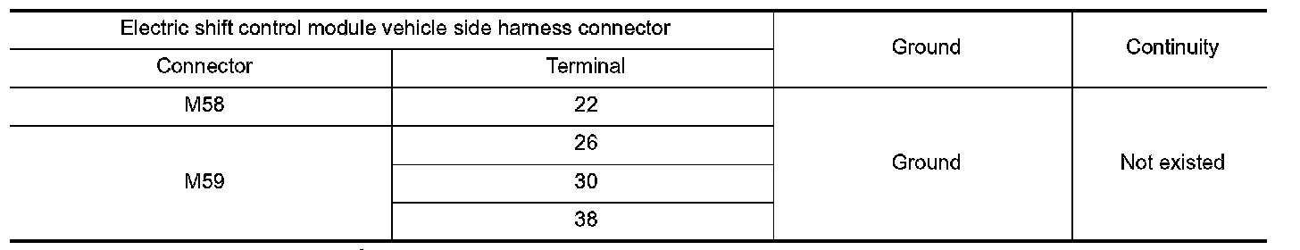Check the continuity between electric shift control module vehicle side harness connector terminals and ground.