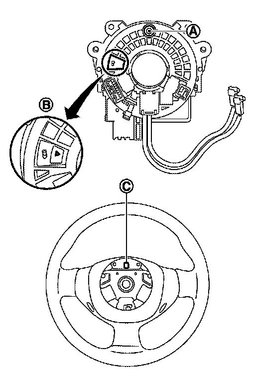 - Adjust the spiral cable locating pin (A) to the steering wheel locating pin hole (C).