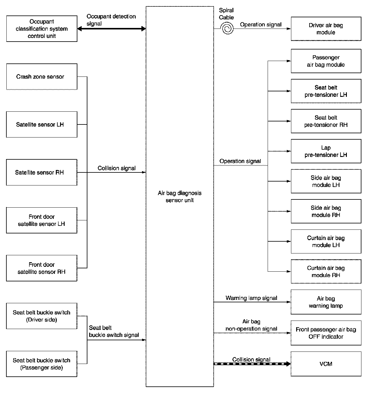 Air bag diagnosis sensor unit supplies power supply to air bag module and pre-tensioner seat belt when deceleration that is more than the specified limit is detected by G sensor in air bag diagnosis sensor unit, crash zone sensor, satellite sensor, or front door satellite sensor.
