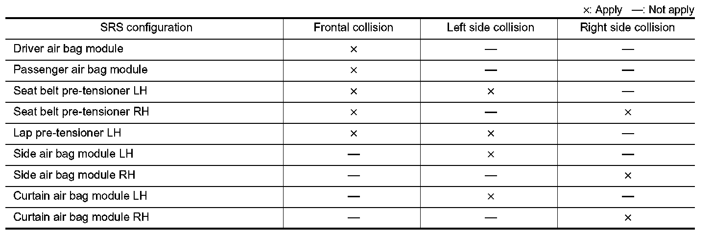 The operation of SRS is different depending on the collision modes applications. For example, the driver air bag module, passenger air bag module, and seat belt pre-tensioner are activated in a frontal collision or side collision.