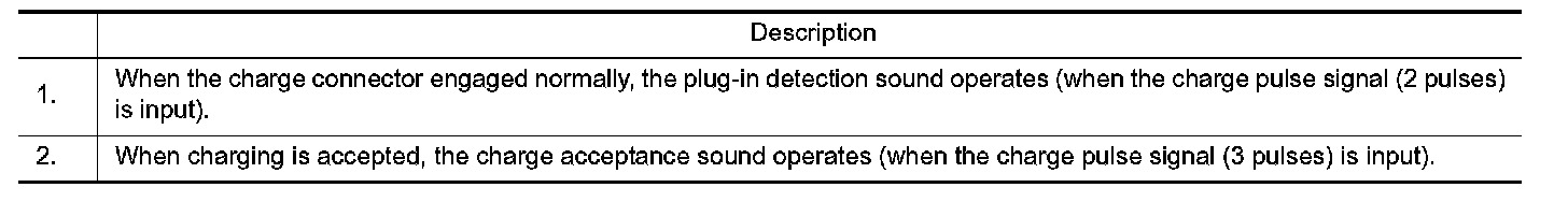 - The charge sound system is a function that notifies of the charge connector status and the charge acceptance status.