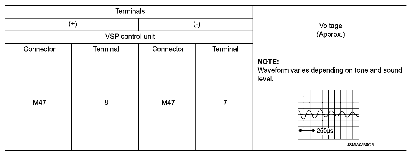 3.Check continuity between VSP control unit harness connector and VSP speaker harness connector.