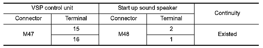 3.Check continuity between VSP control unit harness connector and start up sound speaker harness connector.