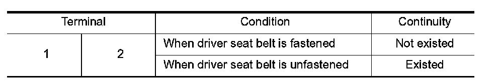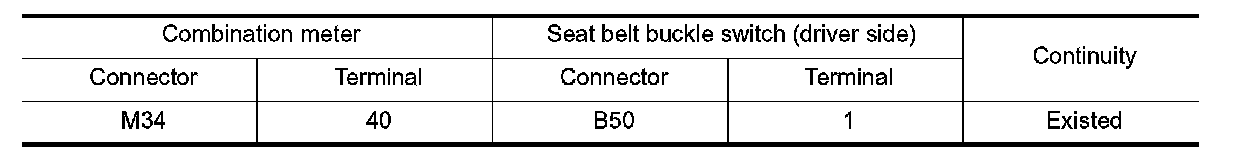 3.Check continuity between combination meter harness connector and seat belt buckle switch (driver side)