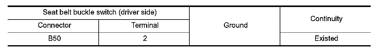 Check harness continuity between seat belt buckle switch (driver side) harness connector and ground.