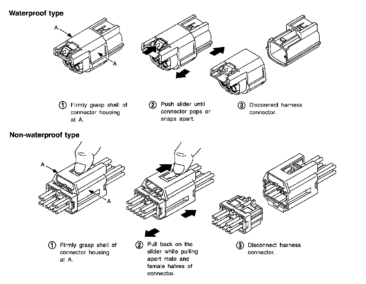 - The slide-locking type connectors are disconnected by pushing or pulling the slider. Refer to the figure below.