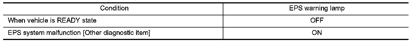 - Turn ON when there is a malfunction in EPS system. If indicates that fail-safe mode is engaged and enters a manual steering state (Control turning force steering wheel becomes heavy).