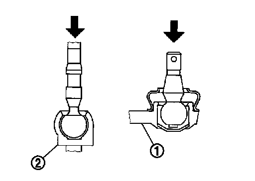 - Apply an axial load of 490 N (50 kg, 110 lb) to ball stud. Using a dial gauge, measure amount of stud movement, and then make sure that the value is within the following specified range. Replace outer socket (1) or steering gear assembly (inner socket) (2) if the measured value is outside the standard.