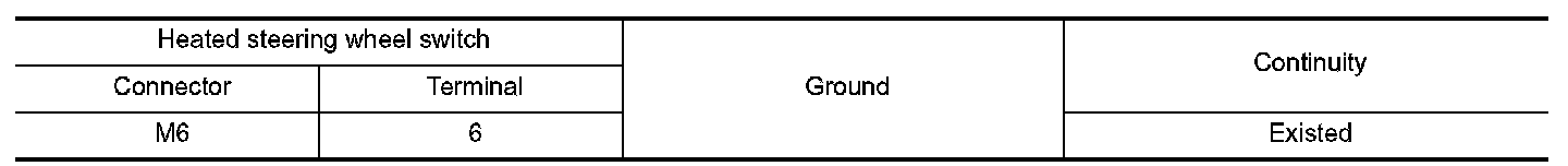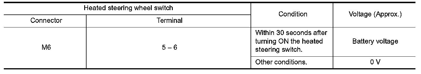 Check heated steering wheel switch. Refer to "HEATED STEERING WHEEL SYSTEM : Heated Steering Wheel Switch" Heated Steering Wheel Switch.