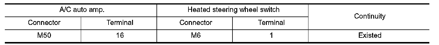 1.Check continuity between A/C auto amp. harness connector terminal and heated steering wheel switch harness connector terminal.