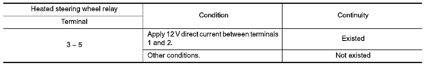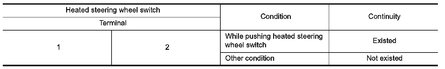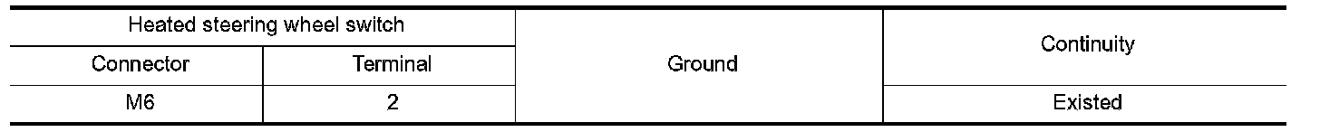 Check heated steering wheel switch. Refer to "HEATED STEERING WHEEL SYSTEM : Heated Steering Wheel Switch" Heated Steering Wheel Switch.