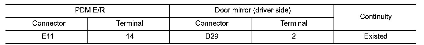 3.Check continuity between IPDM E/R harness connector and door mirror (driver side) harness connector.