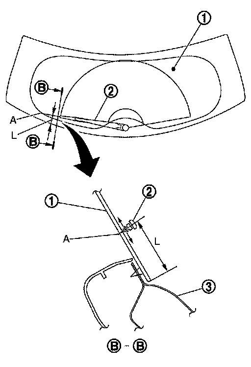 Set the wiper blade top on the defrosting wire (A) (clearance between the end of back door glass and the top of wiper blade center).