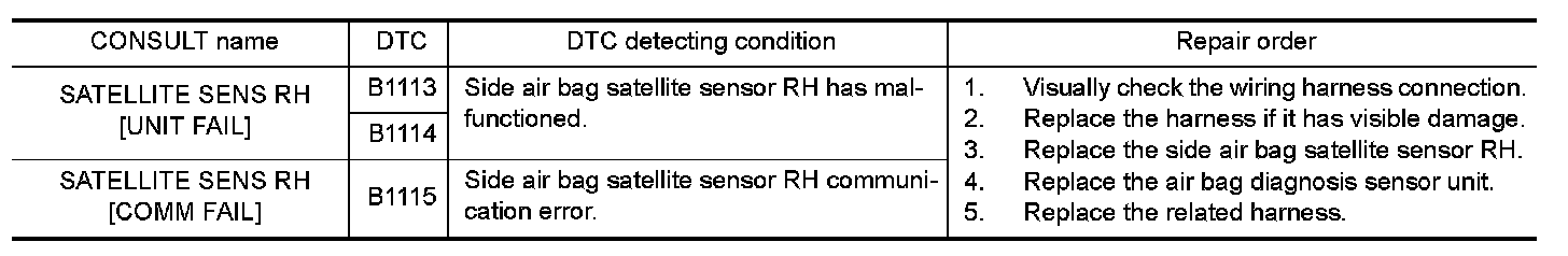 DTC B1113 - B1115 SIDE AIR BAG SATELLITE SENSOR RH