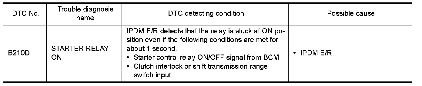 Located in IPDM E/R, it runs the starter motor. The starter relay is turned ON by the BCM when the ignition switch is in START position. IPDM E/R transmits the starter relay ON signal to BCM via CAN communication.