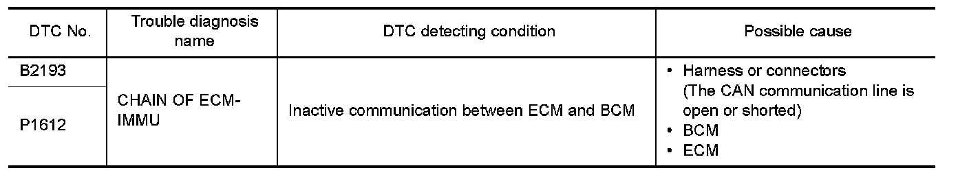 - If DTC B2193 is displayed with DTC U1000, first perform the trouble diagnosis for DTC U1000. Refer to