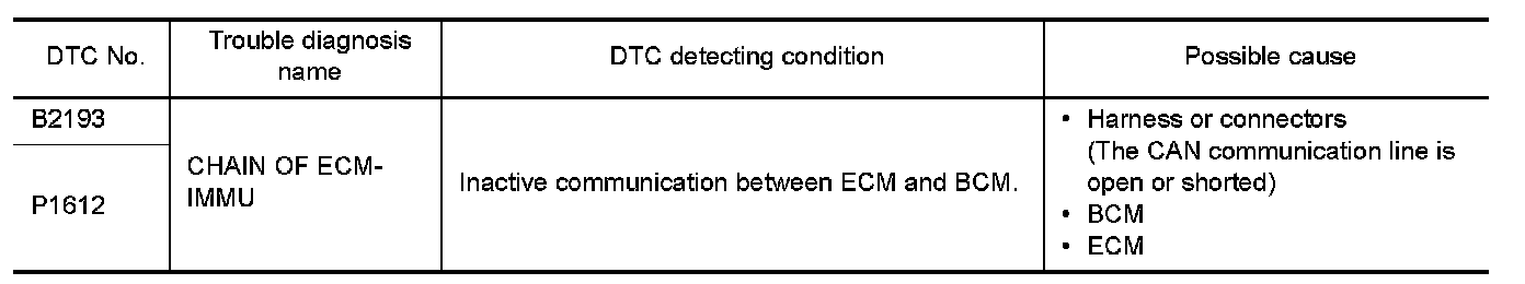 ECM prevents the engine from starting if the ID is not registered. BCM starts the communication with ECM if ignition switch is turned ON.