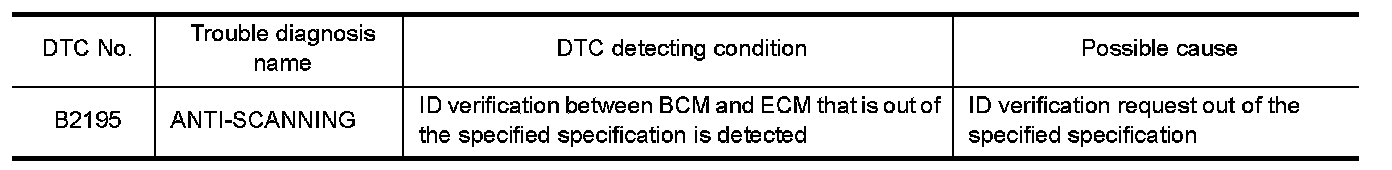 When ignition switch is turned ON, BCM performs ID verification with ECM. If ID verification that is out of the specified specification is detected, BCM prohibits further ID verification and engine cranking.