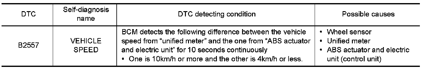 BCM receives the 2 vehicle speed signals via CAN communication. 1 signal is transmitted by the "unified meter" Another signal is transmitted by "ABS actuator and electric unit (control unit)". BCM compares both signals to detect the vehicle speed.
