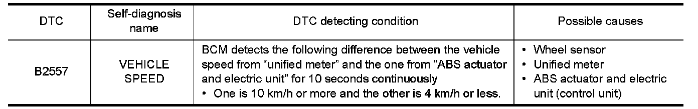 BCM receives the 2 vehicle speed signals via CAN communication. One signal is transmitted by the "unified meter". Another signal is transmitted by "ABS actuator and electric unit (control unit)". BCM compares both signals to detect the vehicle speed.