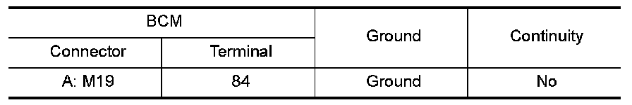 3.Check continuity between BCM harness connector M19 (A) terminal 84 and ground.