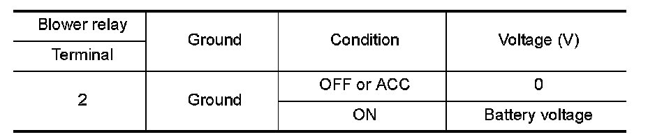 3.Check voltage between blower relay harness connector and ground under the following conditions.