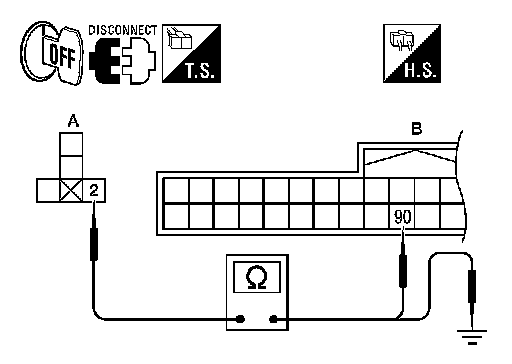 3.Check continuity between blower relay harness connector (A) and BCM harness connector (B).