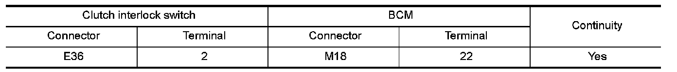 2.Check continuity between clutch interlock switch harness connector and BCM harness connector.