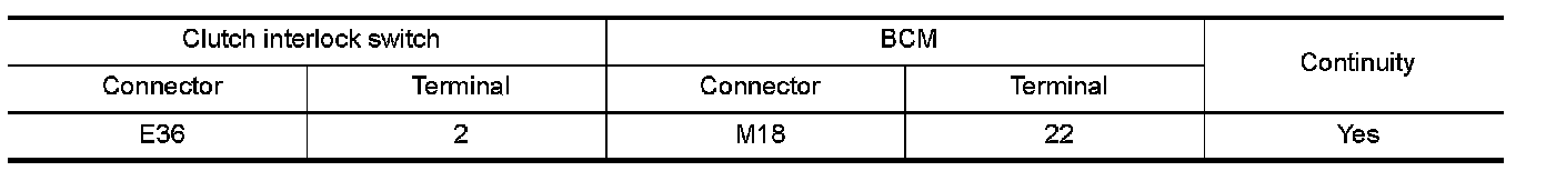 2.Check continuity between clutch interlock switch harness connector and BCM harness connector.