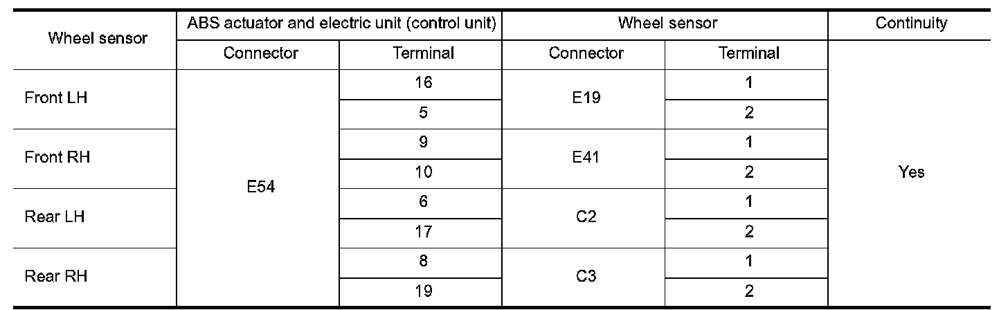 Check continuity between ABS actuator and electric unit (control unit) connector and the malfunctioning wheel sensor connector.