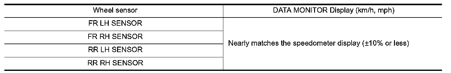 On "DATA MONITOR", select "FR LH SENSOR", "FR RH SENSOR", "RR LH SENSOR", and "RR RH SENSOR", and check the vehicle speed.