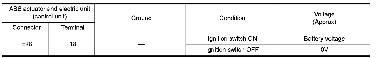 4.Check voltage between ABS actuator and electric unit (control unit) connector E26 terminal 18 and ground.