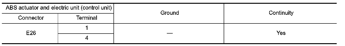 6.Check continuity between ABS actuator and electric unit (control unit) connector E26 terminals 1, 4 and ground.