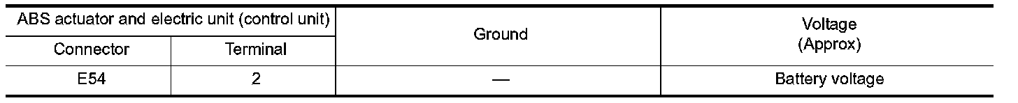3.Check voltage between the ABS actuator and electric unit (control unit) connector E54 terminal 2 and ground.