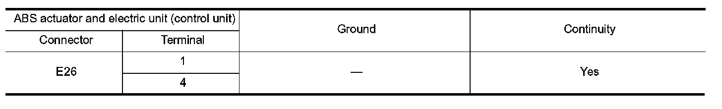 Check continuity between ABS actuator and electric unit (control unit) connector E26 terminals 1, 4 and ground.