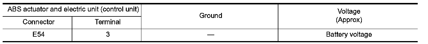 3.Check voltage between ABS actuator and electric unit (control unit) connector E54 terminal 3 and ground.